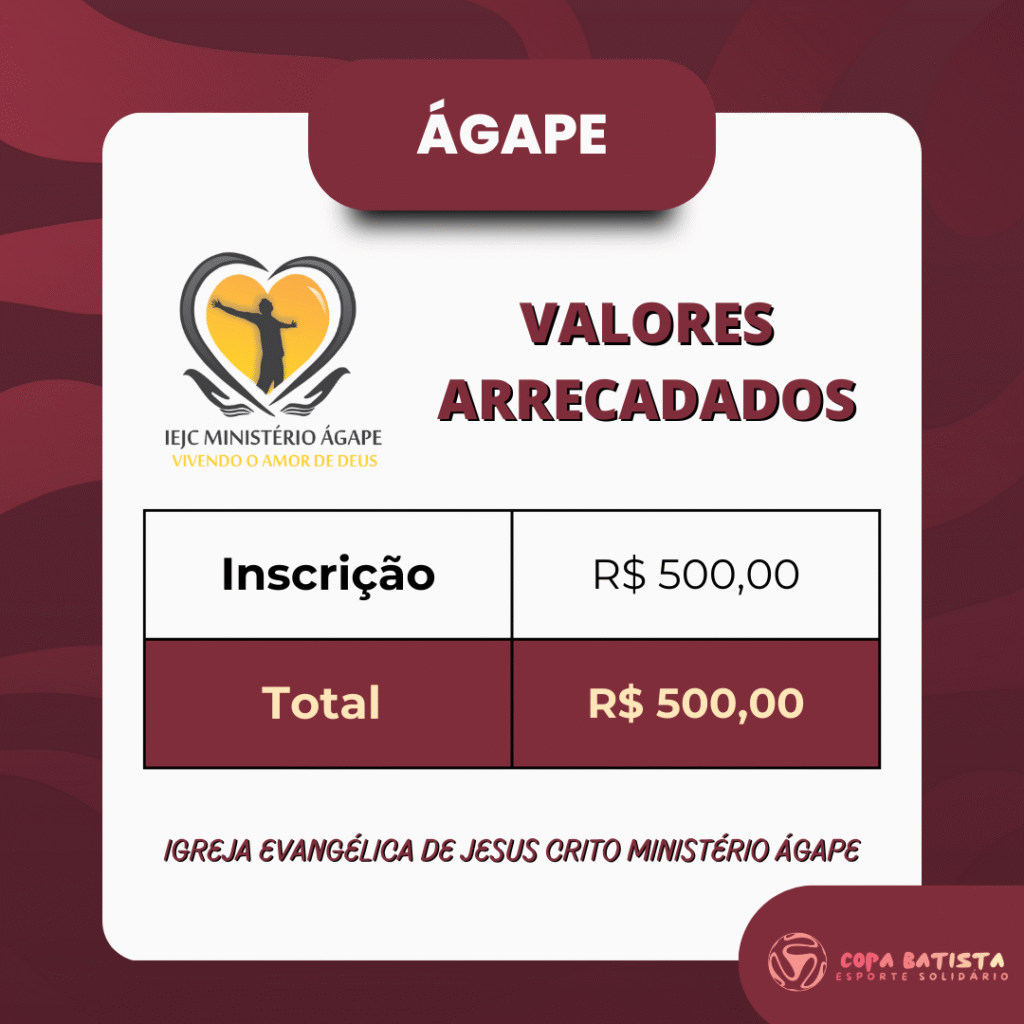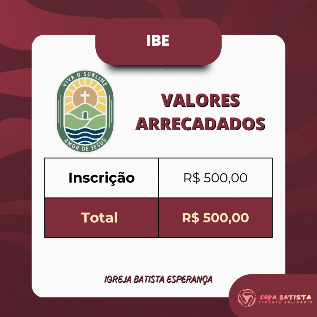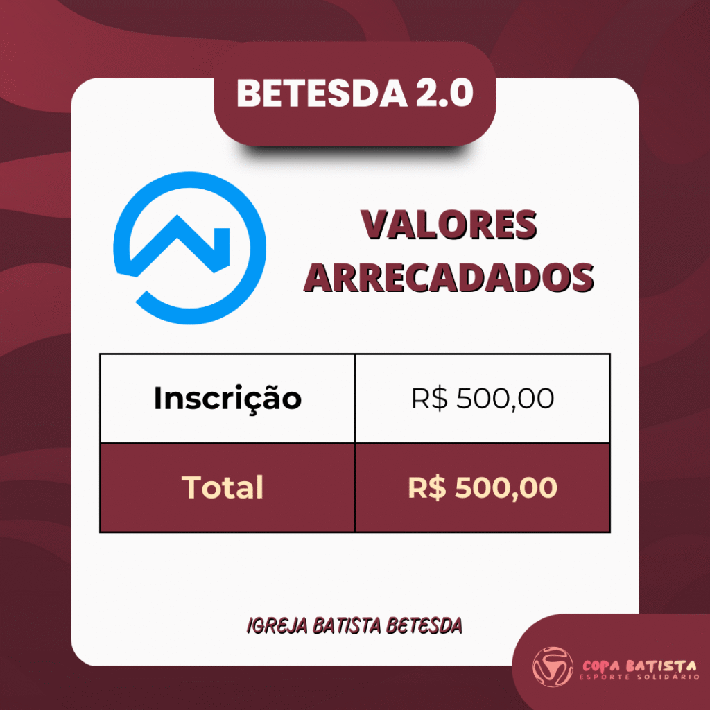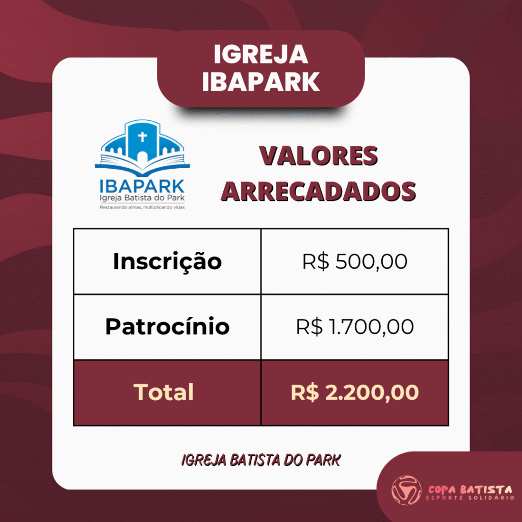 Os valores arrecadados, após a dedução das despesas do evento, foram destinados ao projeto Igreja Batista Sobre Rodas, contribuindo para esta importante causa.