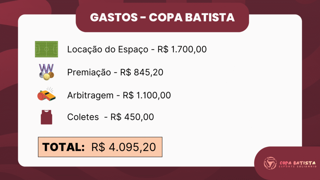 Bem-vindo ao Portal de Transparência da Copa Batista! Este espaço foi criado para garantir que todas as informações financeiras relacionadas ao torneio sejam acessíveis a todos os interessados. Aqui, você encontrará informações, documentações, todos os valores arrecadados e todos os gastos realizados durante o evento. Nosso compromisso é com a transparência e a prestação de contas de todos os envolvidos.